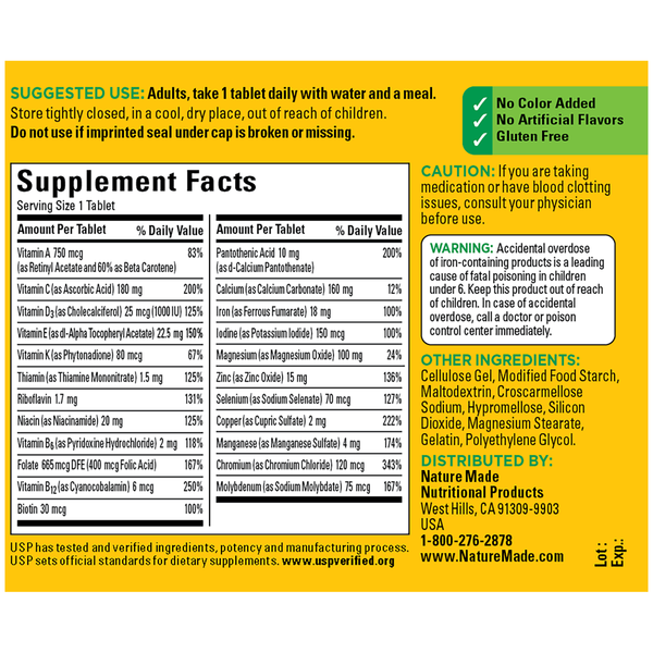 بزرگسالان، روزانه یکی از این قرص های مولتی ویتامین Nature Made را همراه با آب و یک وعده غذایی مصرف کنید.