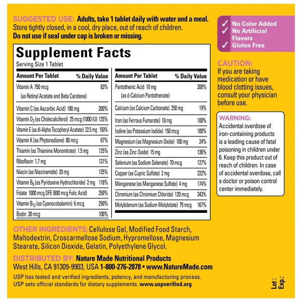 مولتیویتامین Nature Made Multi For Her با فرمولاسیون خاص خود بهطور ویژه برای تأمین نیازهای تغذیهای زنان طراحی شده است. این محصول حاوی ویتامینها، مواد معدنی و آنتیاکسیدانهای ضروری است که به بهبود سلامت عمومی بدن، حفظ انرژی، تقویت سیستم ایمنی و مبارزه با پیری زودرس کمک میکند. در ادامه به بررسی برخی از مهمترین ترکیبات موجود در این مولتیویتامین میپردازیم: