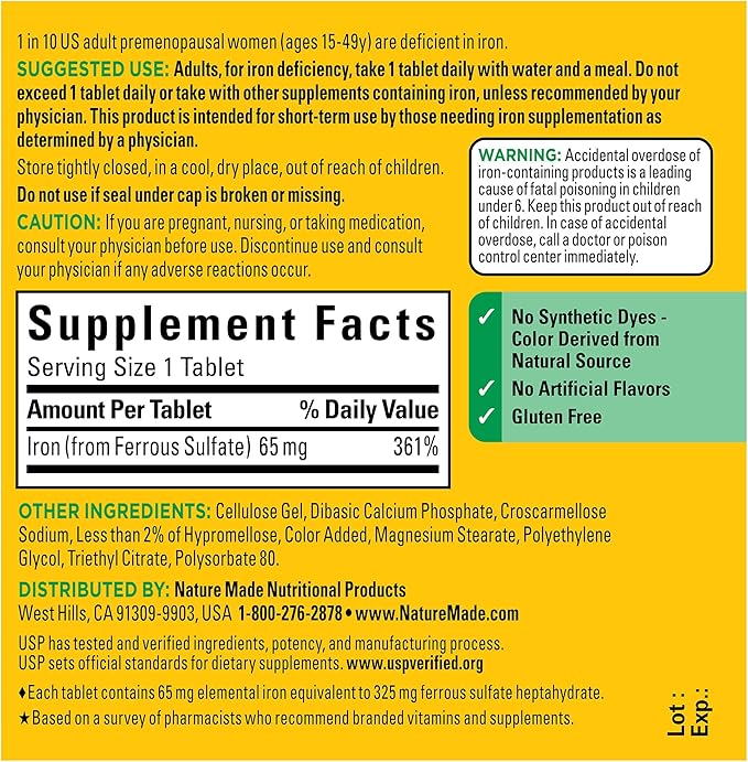برای محافظت از خود، در صورت پاره یا مفقود بودن پلمپ زیر درب، از مصرف آن خودداری کنید. احتیاط: مکملهای آهن ممکن است با داروهای خاصی تداخل داشته باشند. اگر داروهای تجویزی مصرف میکنید، یا باردار یا شیرده هستید، قبل از مصرف این محصول با پزشک خود مشورت کنید. مصرف بیش از حد تصادفی محصولات حاوی آهن، علت اصلی مسمومیت کشنده در کودکان زیر 6 سال است. این محصول را دور از دسترس کودکان نگه دارید. در صورت مصرف بیش از حد تصادفی، فوراً با پزشک یا مرکز کنترل مسمومیت تماس بگیرید.† این اظهارات توسط سازمان غذا و داروی آمریکا ارزیابی نشده است. این محصول برای تشخیص، درمان، یا پیشگیری از هیچ بیماری در نظر گرفته نشده است. این محصول مطابق با استانداردهای ایالات متحده برچسبگذاری شده است و ممکن است با محصولات مشابهی که در جاهای دیگر فروخته میشوند، از نظر ترکیبات، برچسبگذاری و هشدارهای آلرژن متفاوت باشد.