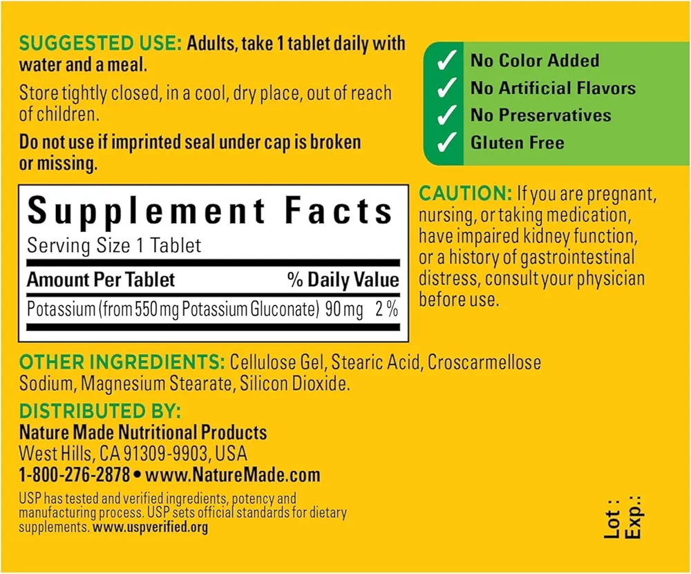 از تولیدکننده: مکمل گلوکونات پتاسیم ۵۵۰ میلیگرمی نیچر مید به عملکردهای مختلف بدن، از جمله تعادل و توزیع مایعات، تعادل pH و عملکرد سلولهای عضلانی و عصبی کمک میکند. سطح پتاسیم سالم بخش مهمی از سلامت قلب و حفظ فشار خون است. مکمل گلوکونات پتاسیم ۵۵۰ میلیگرمی نیچر مید به عملکردهای مختلف بدن، از جمله تعادل و توزیع مایعات، تعادل pH و عملکرد سلولهای عضلانی و عصبی کمک میکند. گلوکونات پتاسیم ۵۵۰ میلیگرمی نیچر مید همچنین از عملکرد سالم قلب، کلیه و غده فوق کلیوی و تبدیل قند خون به شکل ذخیره شده آن که به عنوان گلیکوژن شناخته میشود، پشتیبانی میکند. به تنظیم فعالیت عضلات قلب کمک میکند. گلوکونات پتاسیم نیچر مید مطابق با استانداردهای بالای کیفیت ما تضمین شده است: از مواد اولیه با دقت انتخاب شده تحت فرآیندهای تولید دقیق ساخته شده است. تأیید شده توسط فارماکوپه ایالات متحده (USP). فرموله شده برای جذب آسان. بدون رنگ، طعم دهنده یا مواد نگهدارنده مصنوعی. بدون مخمر، نشاسته یا گلوتن. این اظهارات توسط سازمان غذا و دارو ارزیابی نشده است. این محصول برای تشخیص، درمان، یا پیشگیری از هیچ بیماری در نظر گرفته نشده است. ترکیبات: گلوکونات پتاسیم، ژل سلولز، اسید استئاریک، کراسکارملوز سدیم، استئارات منیزیم، دی اکسید سیلیکون. بدون رنگ مصنوعی. بدون طعم دهنده مصنوعی. بدون مواد نگهدارنده. بدون مخمر. بدون نشاسته. بدون گلوتن. اطلاعات تغذیهای: دریافت پتاسیم مورد نیاز از رژیم غذایی بسیار آسان است. بهترین منابع پتاسیم میوهها و سبزیجات هستند. موز، سیب زمینی، مرکبات، گوجه فرنگی، آلو و اسفناج غذاهای سرشار از پتاسیم محسوب میشوند. از آنجا که ترکیبات ممکن است هر از گاهی تغییر کنند، لطفاً برچسب پایین را بررسی کنید.