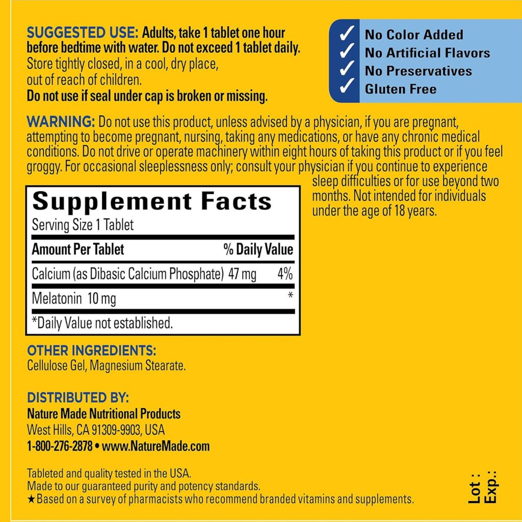 برای بزرگسالان، یک (1) کپسول قبل از خواب مصرف شود زیرا ملاتونین ممکن است باعث خوابآلودگی شود.