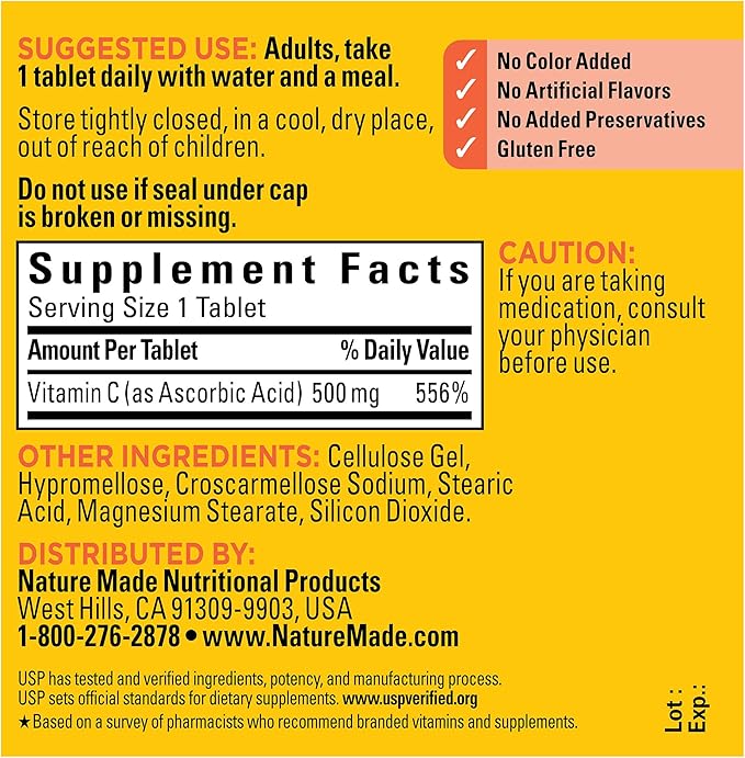 هر قرص Nature Made Vitamin C با دوز ۵۰۰ میلیگرم طراحی شده تا سطح مناسب ویتامین C در بدن حفظ شود بدون اینکه از حد مجاز (۲۰۰۰ میلیگرم در روز) عبور کند.