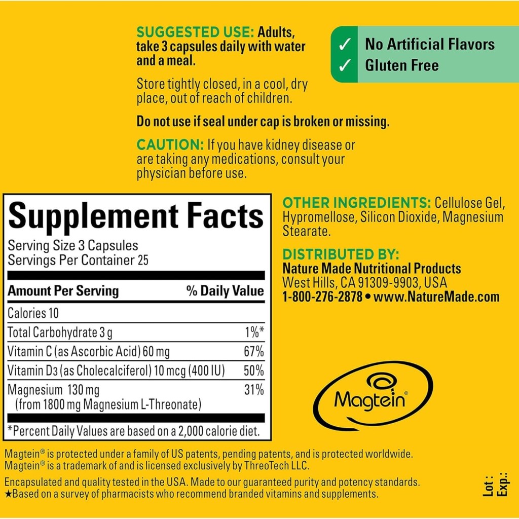 کپسول منیزیم ال-ترئونات NatureMade Magnesium L-Threonate + D3 + C نیچرمید (75 عددی)