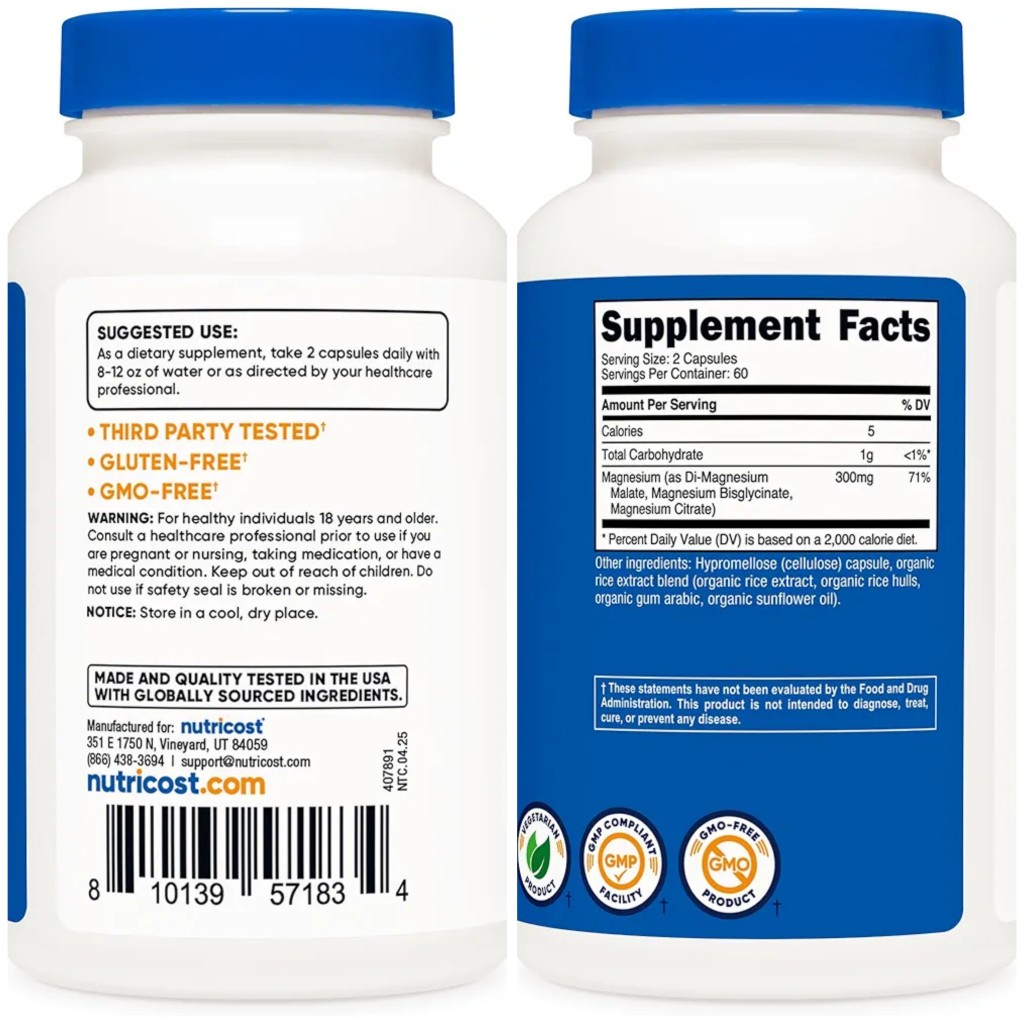 منیزیم (به صورت دی-منیزیم مالات، منیزیم بیس گلیسینات، منیزیم سیترات)، کپسول هیپروملوز (سلولز)، مخلوط عصاره برنج ارگانیک (عصاره برنج ارگانیک، پوسته برنج ارگانیک، صمغ عربی ارگانیک، روغن آفتابگردان ارگانیک).