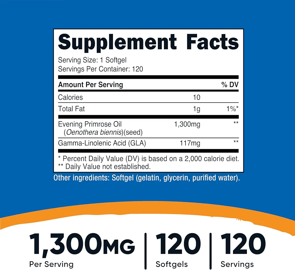 ۱۳۰۰ میلیگرم (EPO)، استاندارد شده تا ۱۰٪ GLA از روغن غیر GMO با پرس سرد
