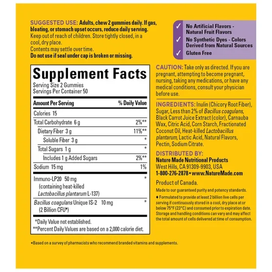 ترکیبی است از “پریبیوتیک + پروبیوتیک + پُستبِیوتیک” در قالب آبنبات جویدنی (gummy) — هدف آن حمایت از سلامت دستگاه گوارش، حفظ تعادل میکروبیوم روده و تقویت سیستم ایمنی است. این محصول بدون گلوتن بوده، با طعم لیمو و تمشک عرضه میشود